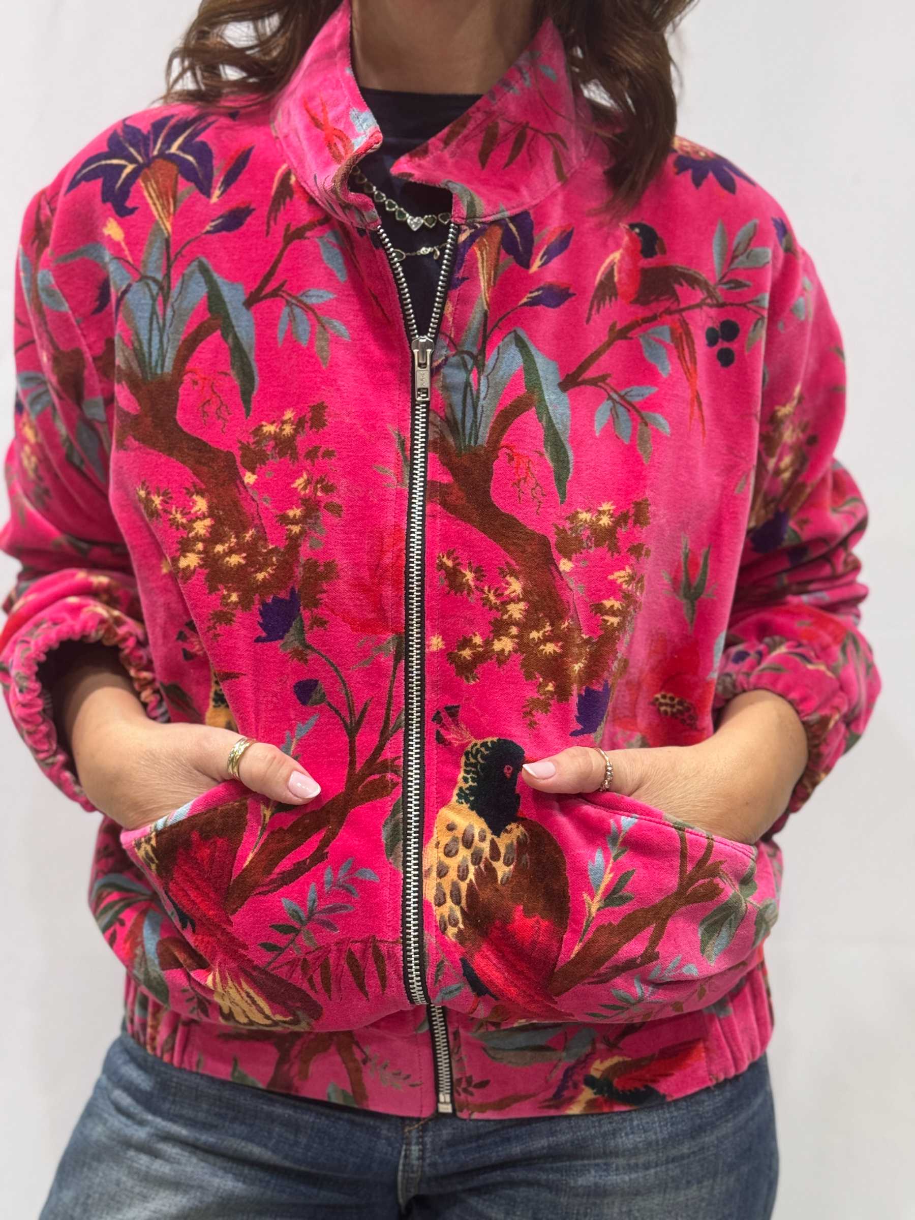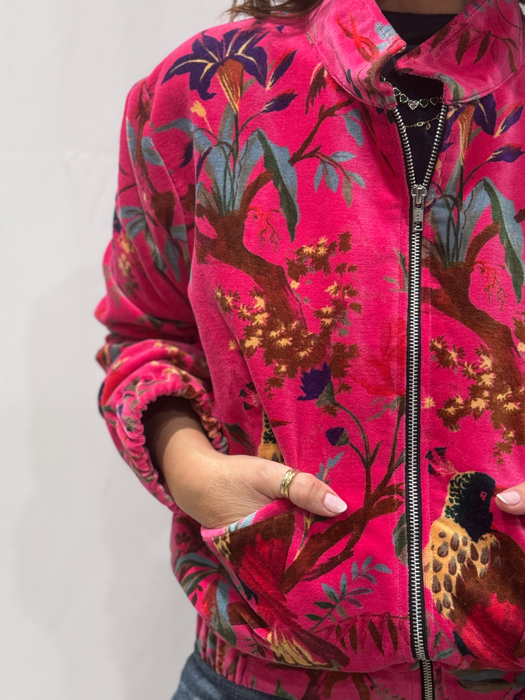 Apportez une touche de couleur et d’originalité à votre dressing avec le blouson Luna. Ce blouson en velours rose fuchsia séduit par ses imprimés floraux et ses oiseaux aux nuances marron, vert, mauve et beige. Une pièce forte qui attire le regard tout en restant élégante.