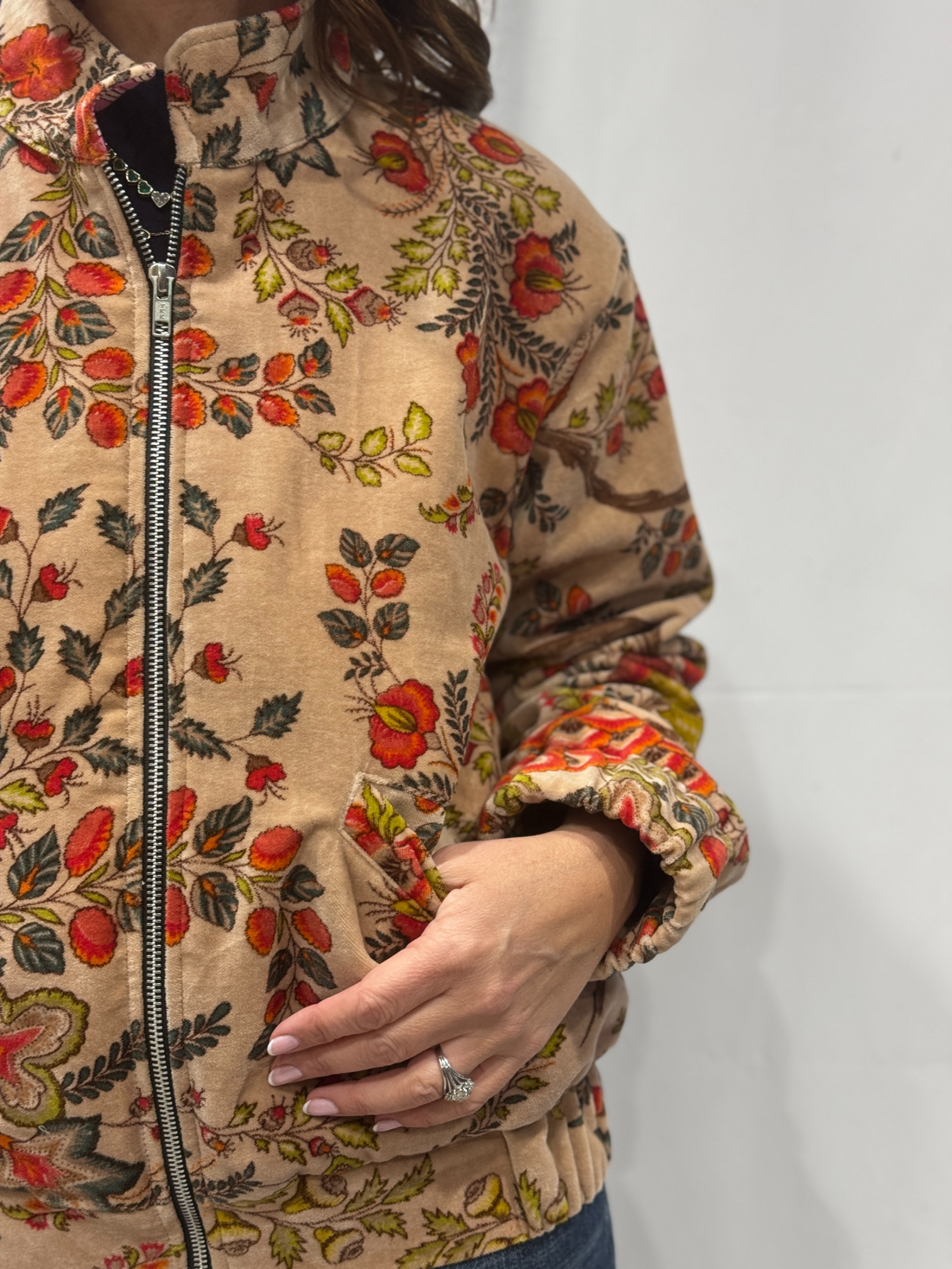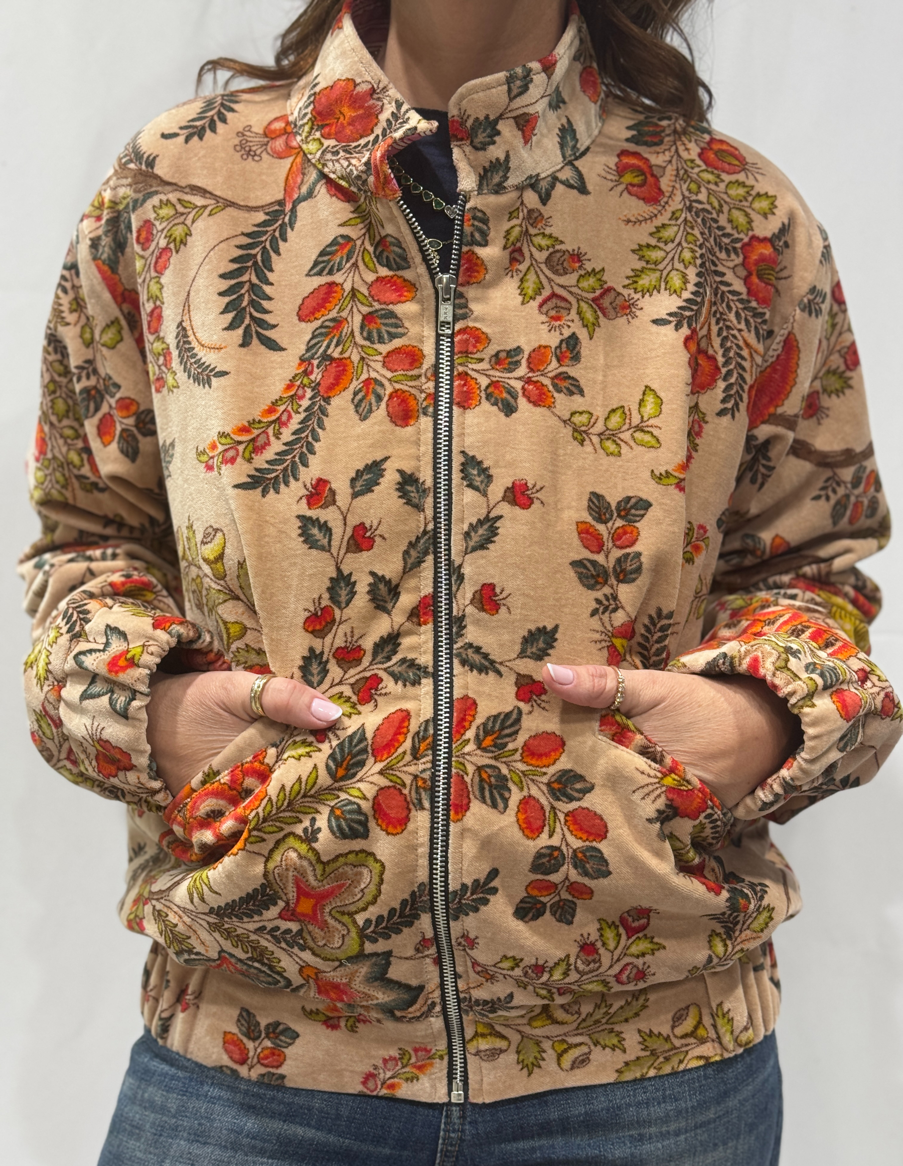 Apportez douceur et élégance à votre dressing avec le blouson Riva. Ce blouson en velours rose poudré séduit par ses imprimés floraux aux tons verts, rouges et oranges. Une harmonie de couleurs qui illumine la silhouette et apporte une touche raffinée à chaque tenue.