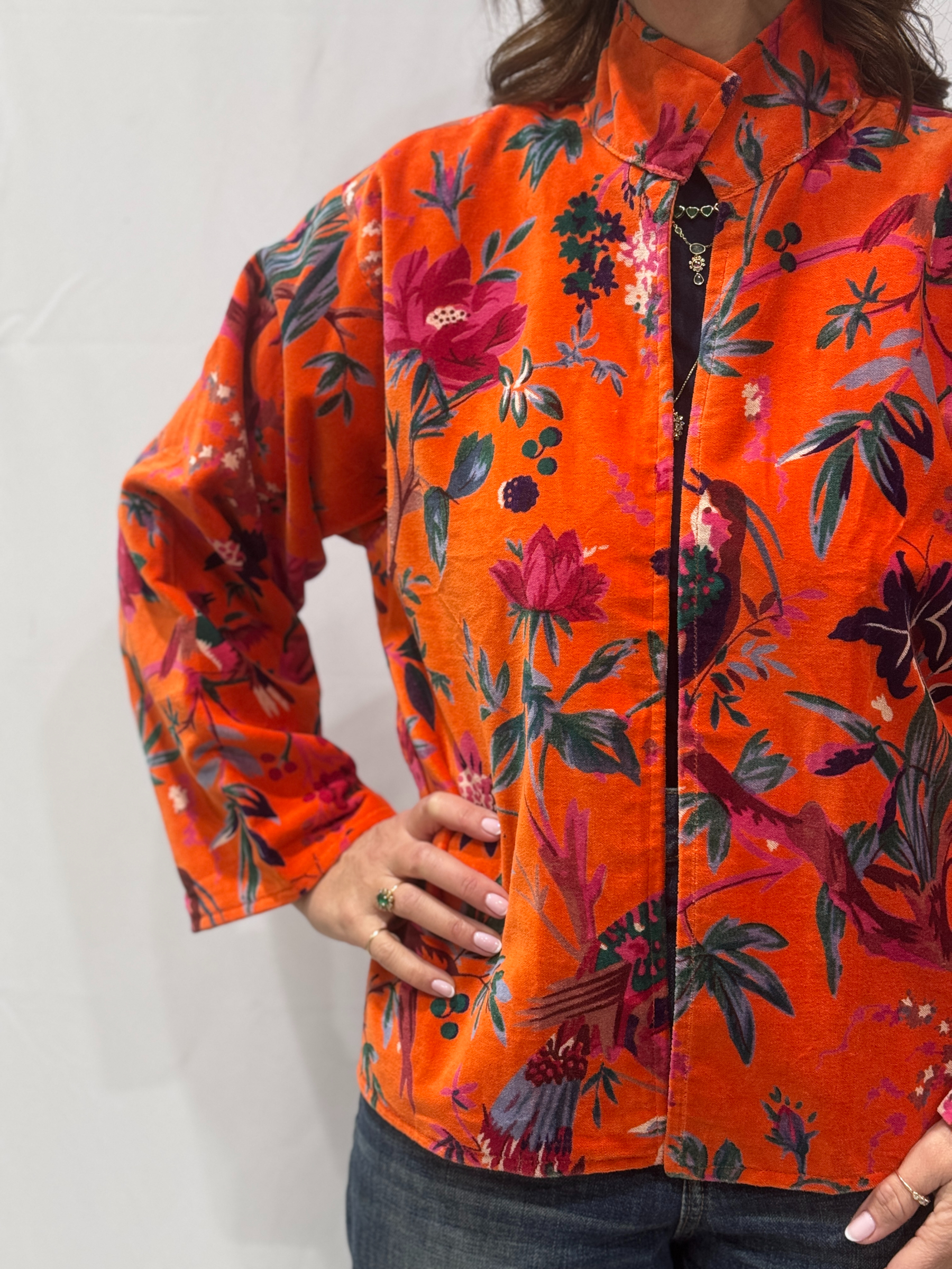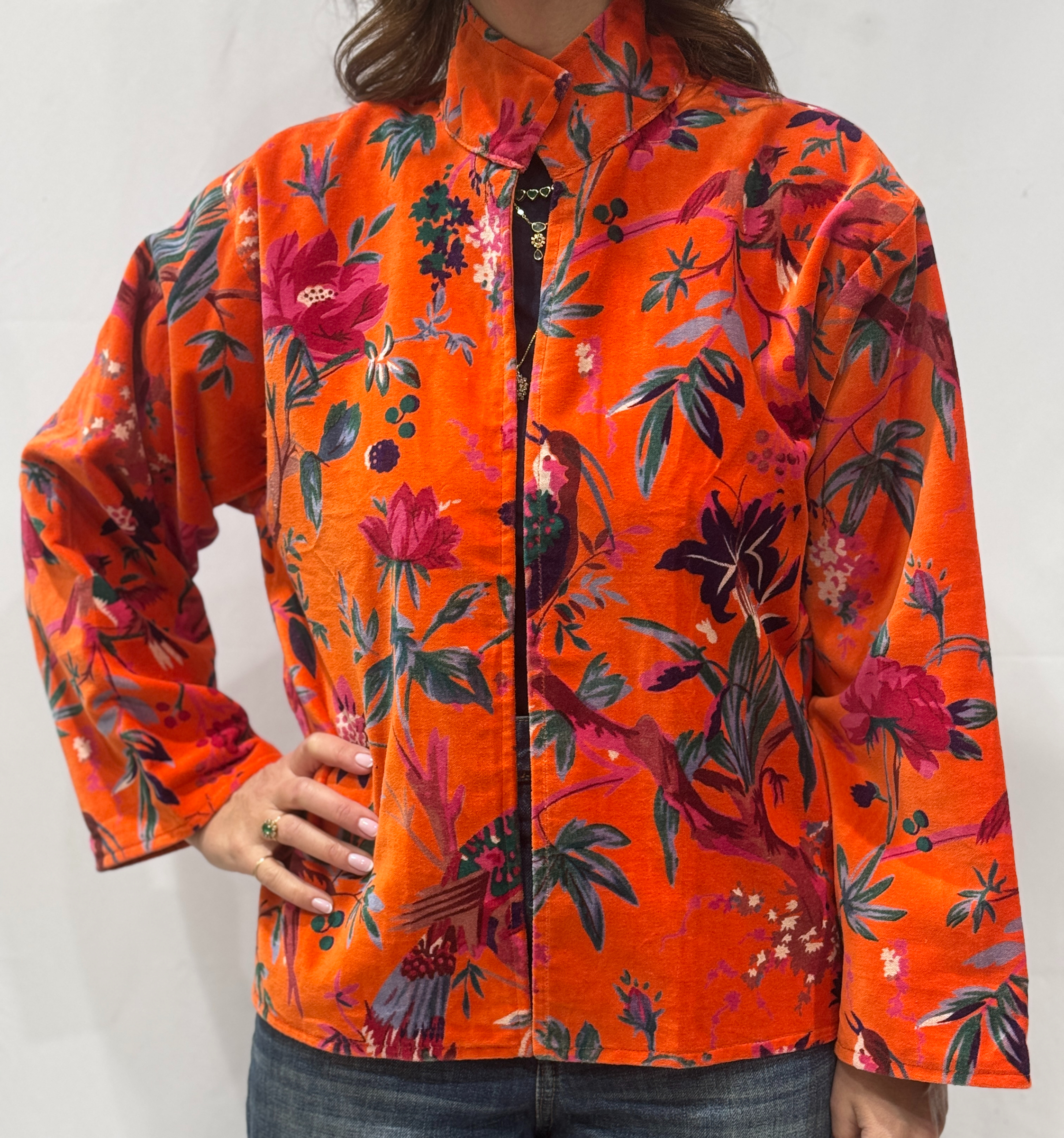 La veste Selina combine douceur et style. Son velours orange offre un toucher agréable et un aspect raffiné. Les imprimés floraux multicolores apportent de la couleur et de la vie à votre tenue.