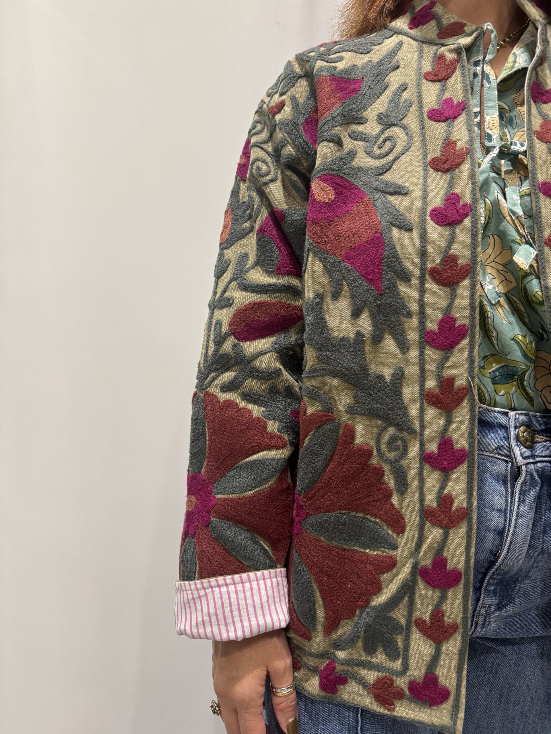 Choisir la veste Sha, c’est opter pour une pièce artisanale de caractère, à la fois élégante et originale. Ses broderies Suzani colorées et sa doublure rayée intérieure créent une harmonie unique entre tradition et modernité. Cette veste brodée tendance deviendra vite un incontournable de votre garde-robe.