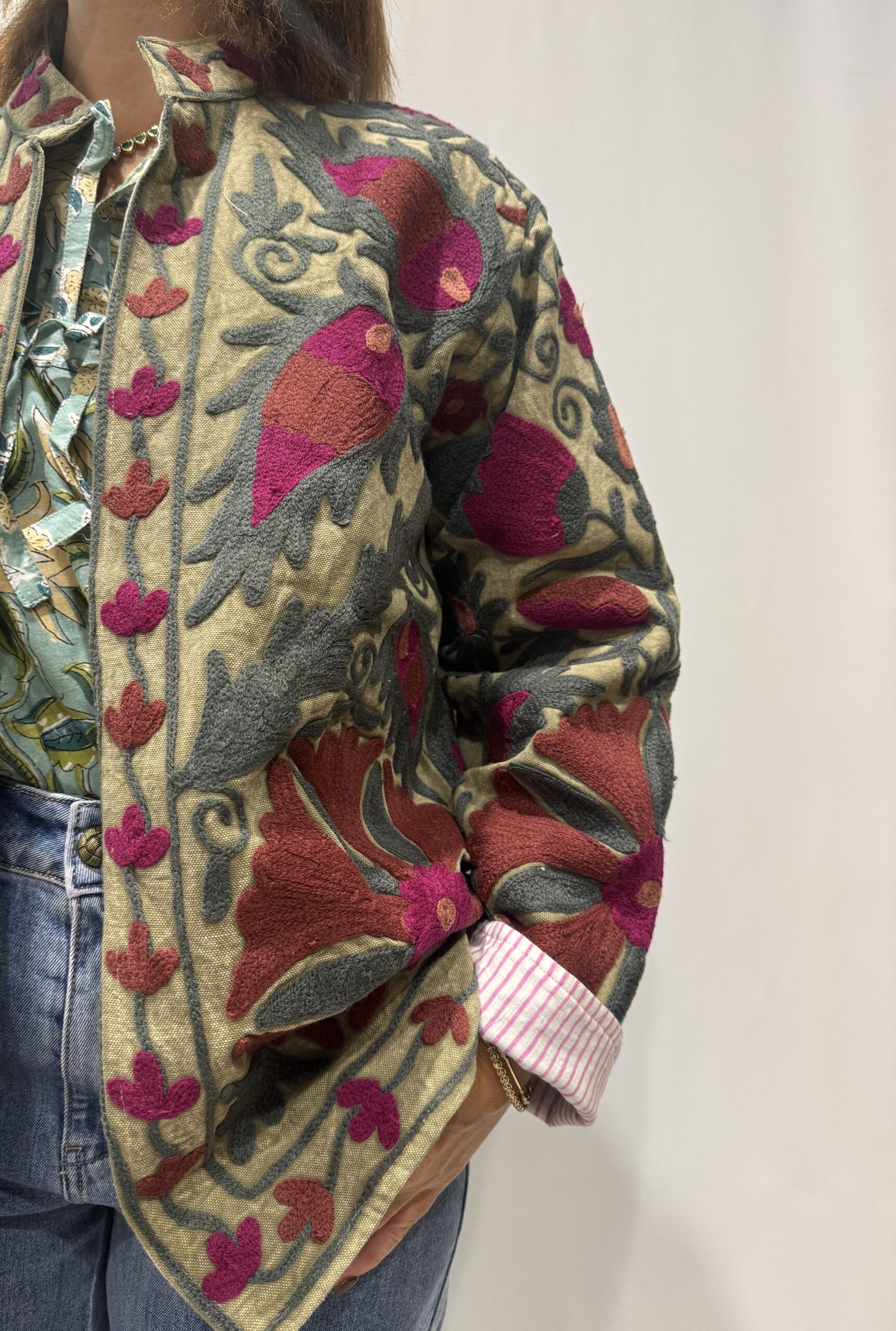 Affirmez votre style avec la veste Sha brodée. Cette veste courte en coton kaki se distingue par ses broderies Suzani artisanales aux tons terracota, prune et kaki foncé. Chaque motif reflète l’authenticité du savoir-faire indien et transforme cette pièce en vêtement unique.