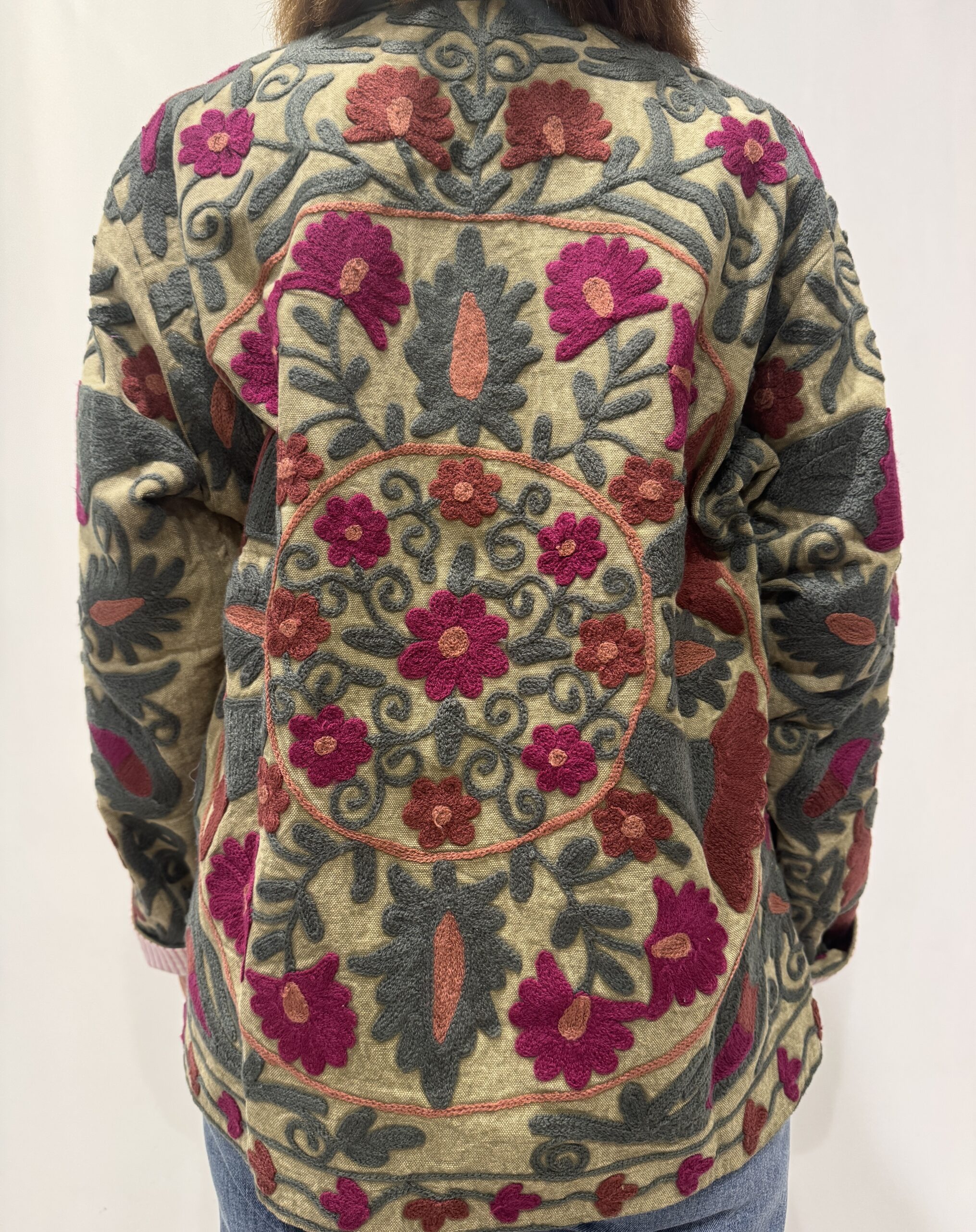 La veste Sha se porte au quotidien comme lors d’occasions spéciales. Associez-la à un jean pour un look décontracté chic, ou à une jupe et des accessoires pour un rendu plus habillé. Ses couleurs profondes et ses broderies Suzani attirent le regard et subliment vos tenues.