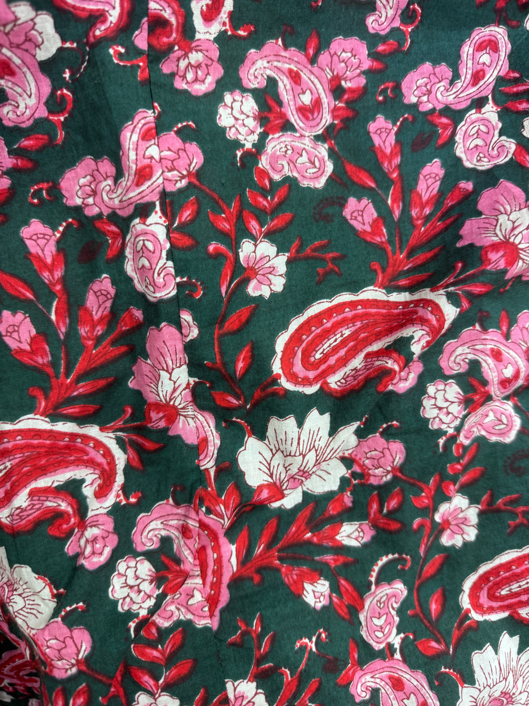 Les motifs, dans des nuances de rose, rouge et blanc, créent un contraste harmonieux avec le fond de la blouse. Cet imprimé floral donne à la pièce une identité forte tout en conservant une certaine élégance.