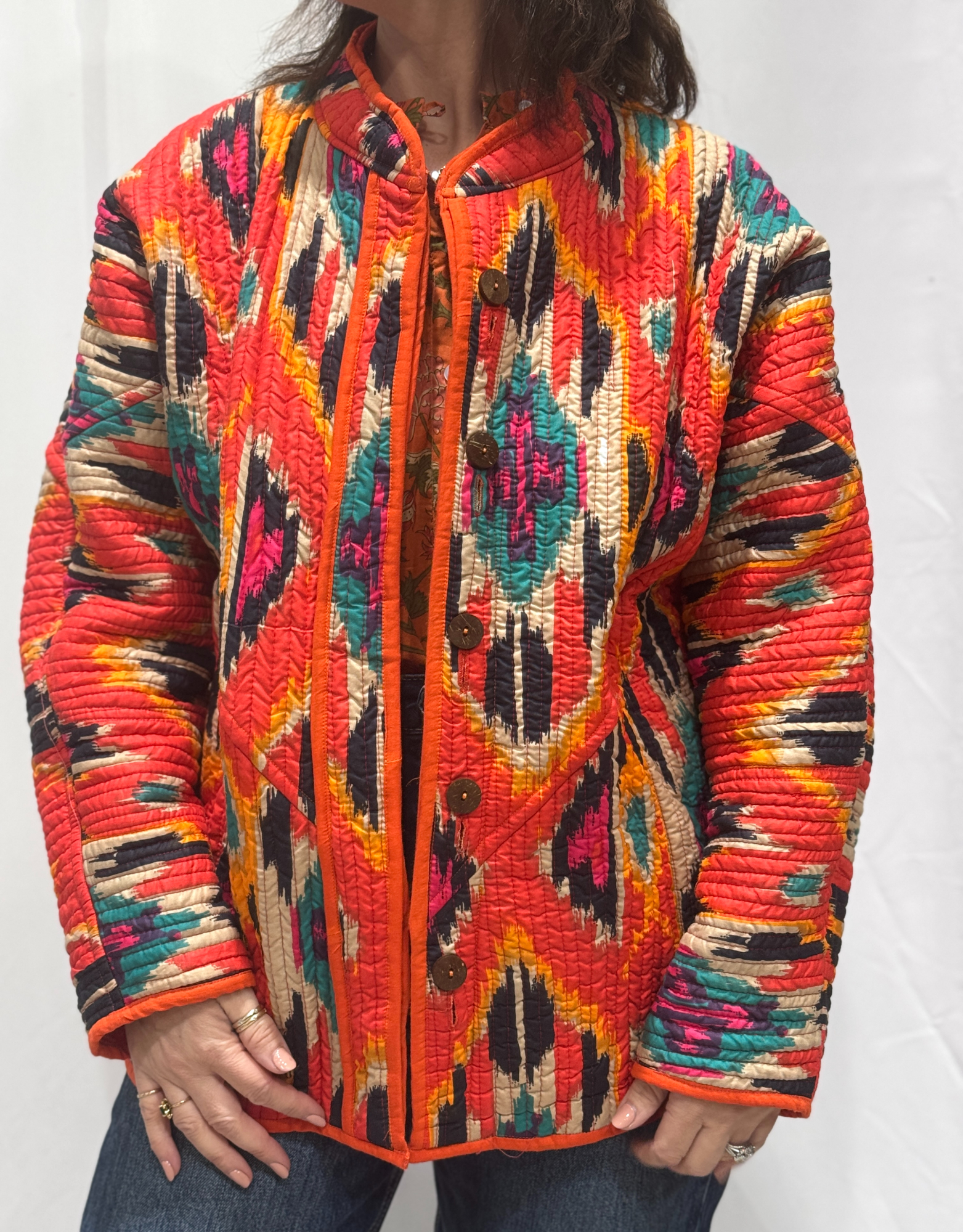 À l’intérieur, le coton imprimé révèle un univers plus audacieux. Les motifs apportent de la personnalité et permettent de transformer complètement le style de la veste Dihya.