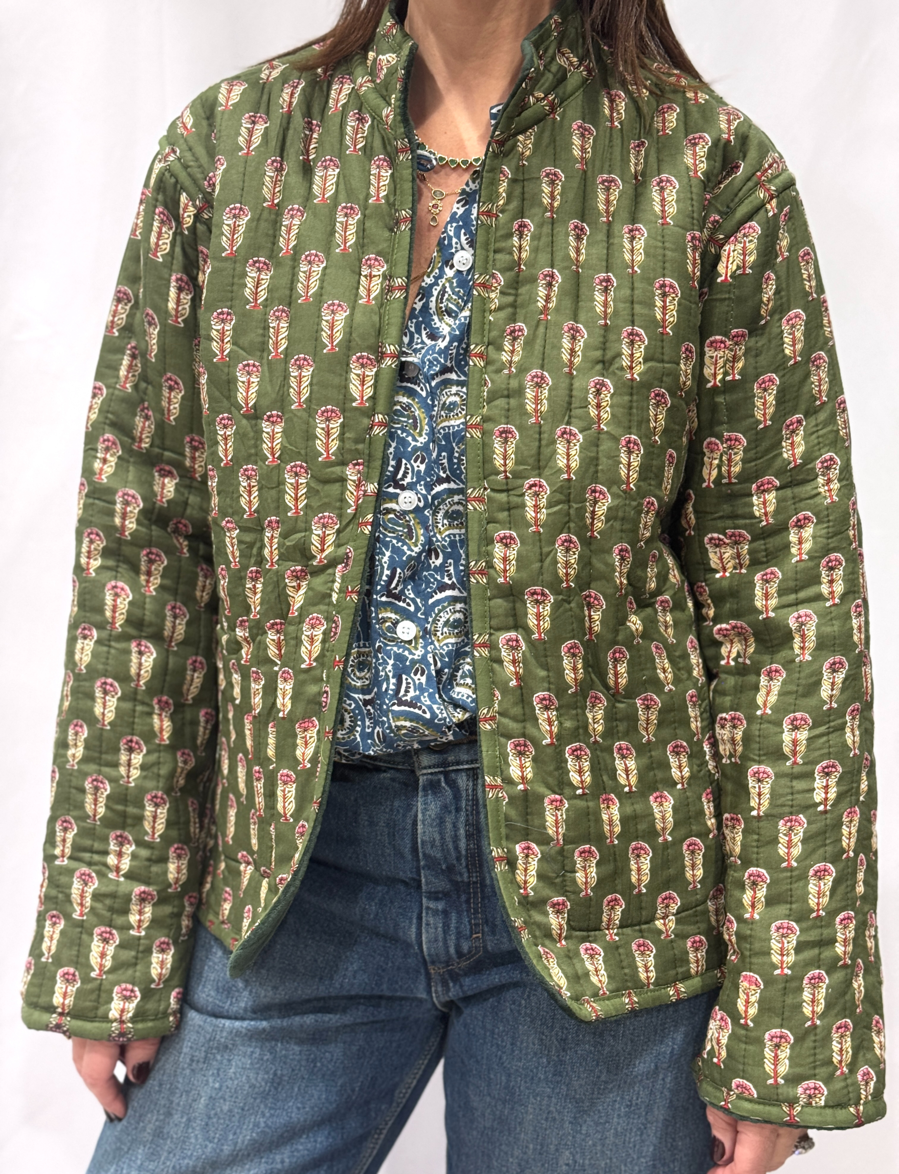 À l’extérieur, le velours uni offre un rendu chic et lumineux. La matière capte subtilement la lumière et donne de la profondeur à la couleur. À l’intérieur, le coton imprimé révèle un univers plus audacieux. Grâce à sa conception réversible, la veste permet de changer de style en un instant. Vous pouvez choisir un look sobre ou plus expressif selon votre tenue.