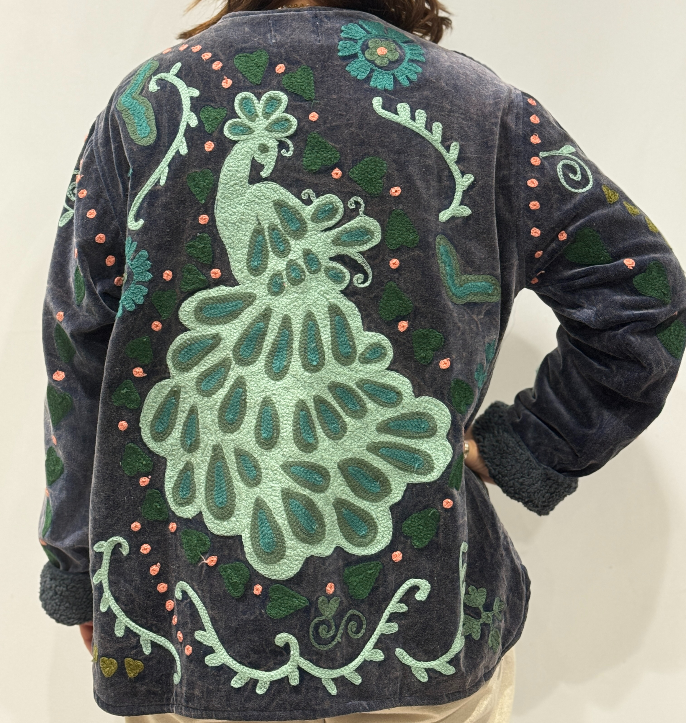 Les broderies représentent des fleurs et des détails fins qui parcourent la surface du tissu. Dans le dos, un grand paon s’impose au centre, brodé de dégradés de bleus. Autour de lui, des cœurs vert foncé complètent la composition et ajoutent une note d’équilibre et de douceur.