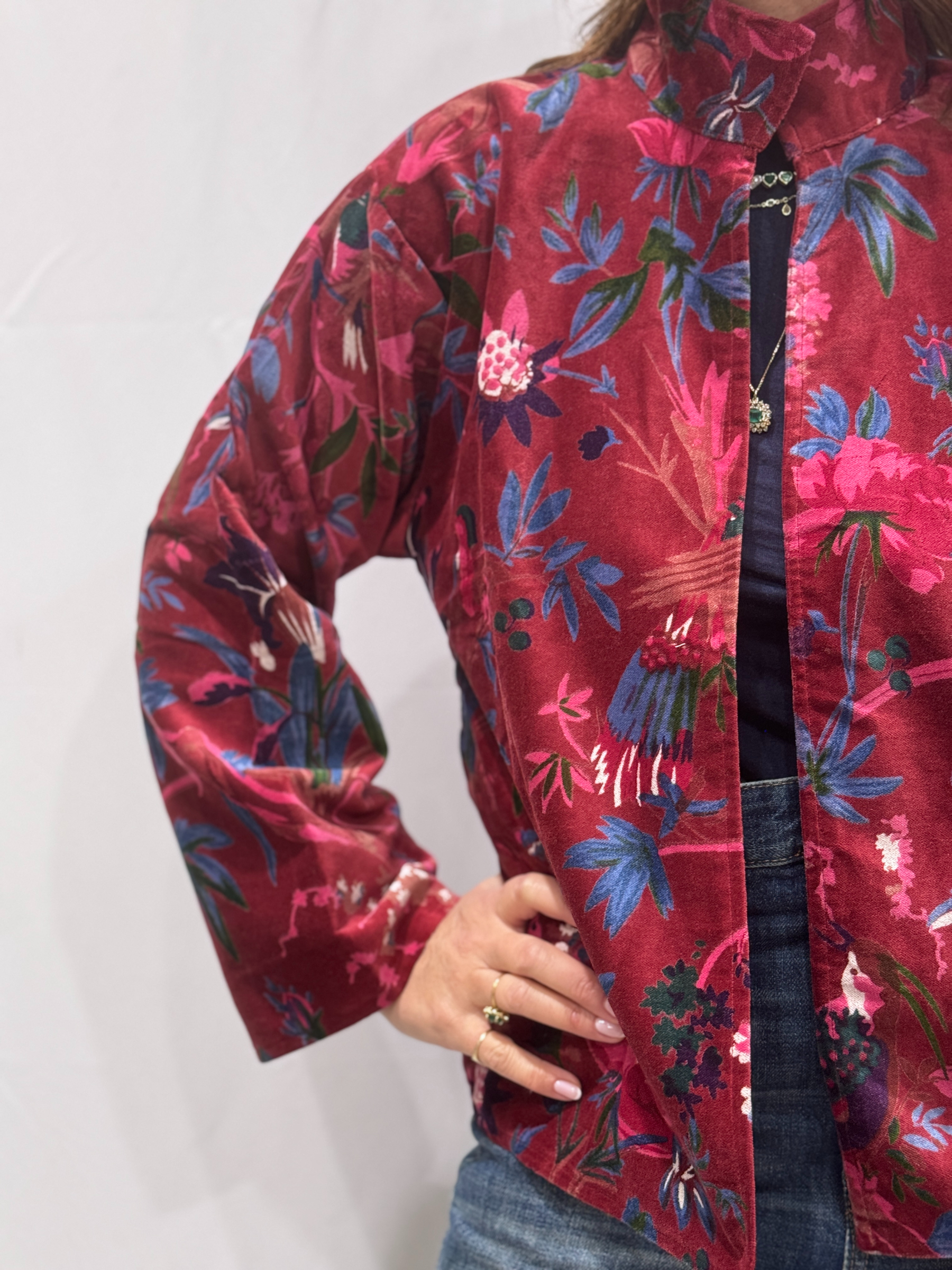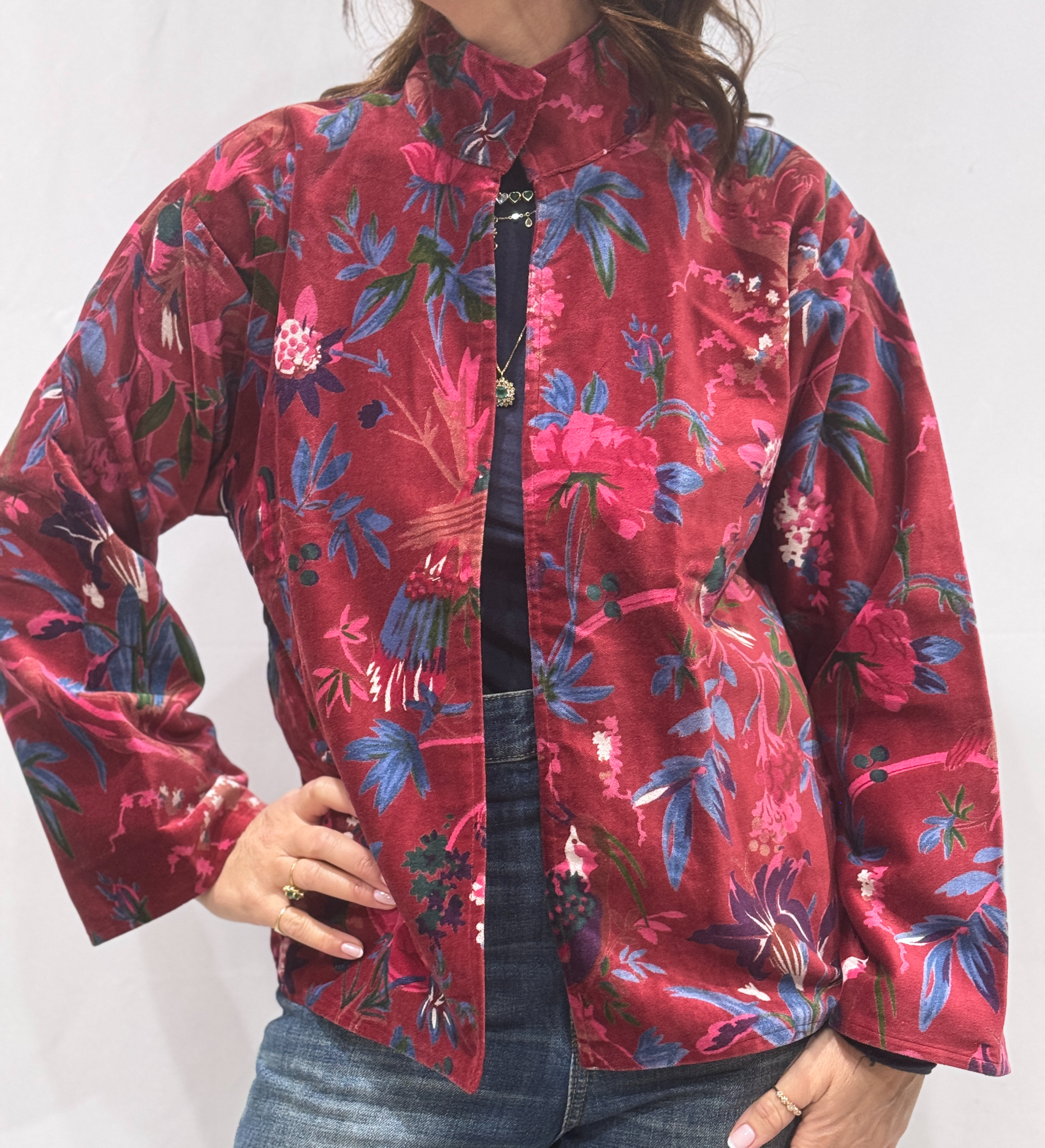 La veste Nalia combine douceur et style. Son velours bordeaux offre un toucher agréable et un aspect raffiné. Les imprimés floraux roses, verts, et bleus apportent de la couleur et de la vie à votre tenue.