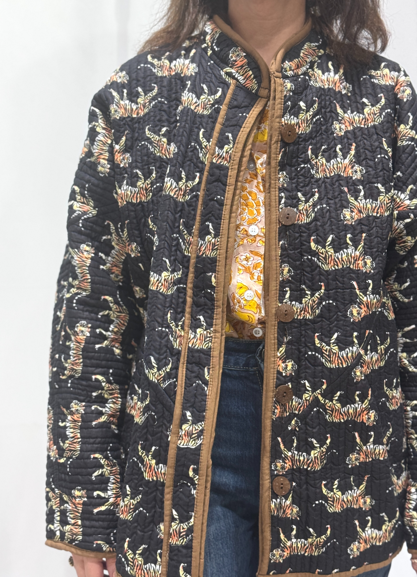 À l’intérieur, le coton imprimé révèle un univers plus audacieux. Les motifs apportent de la personnalité et permettent de transformer complètement le style de la veste Ritua.