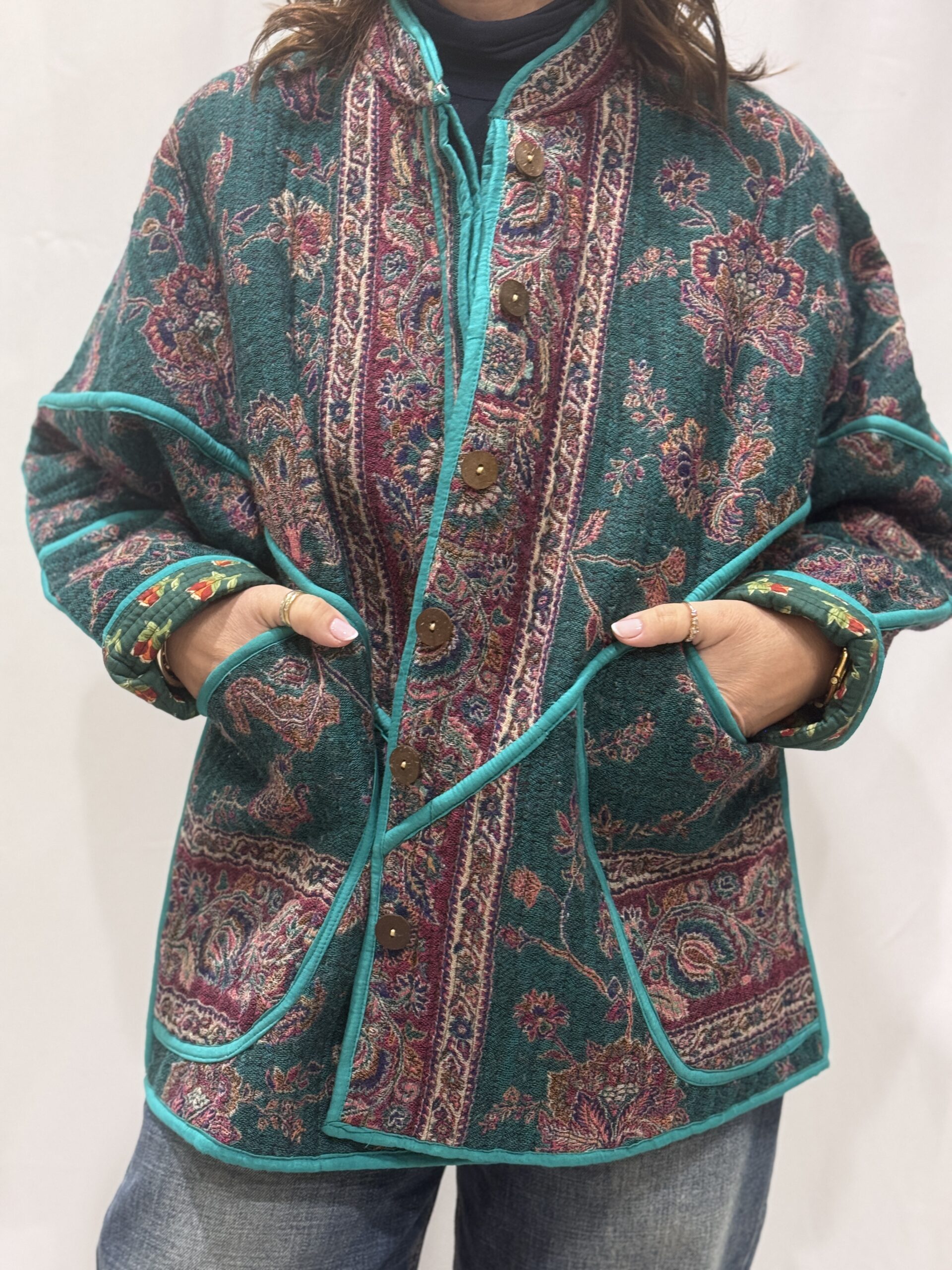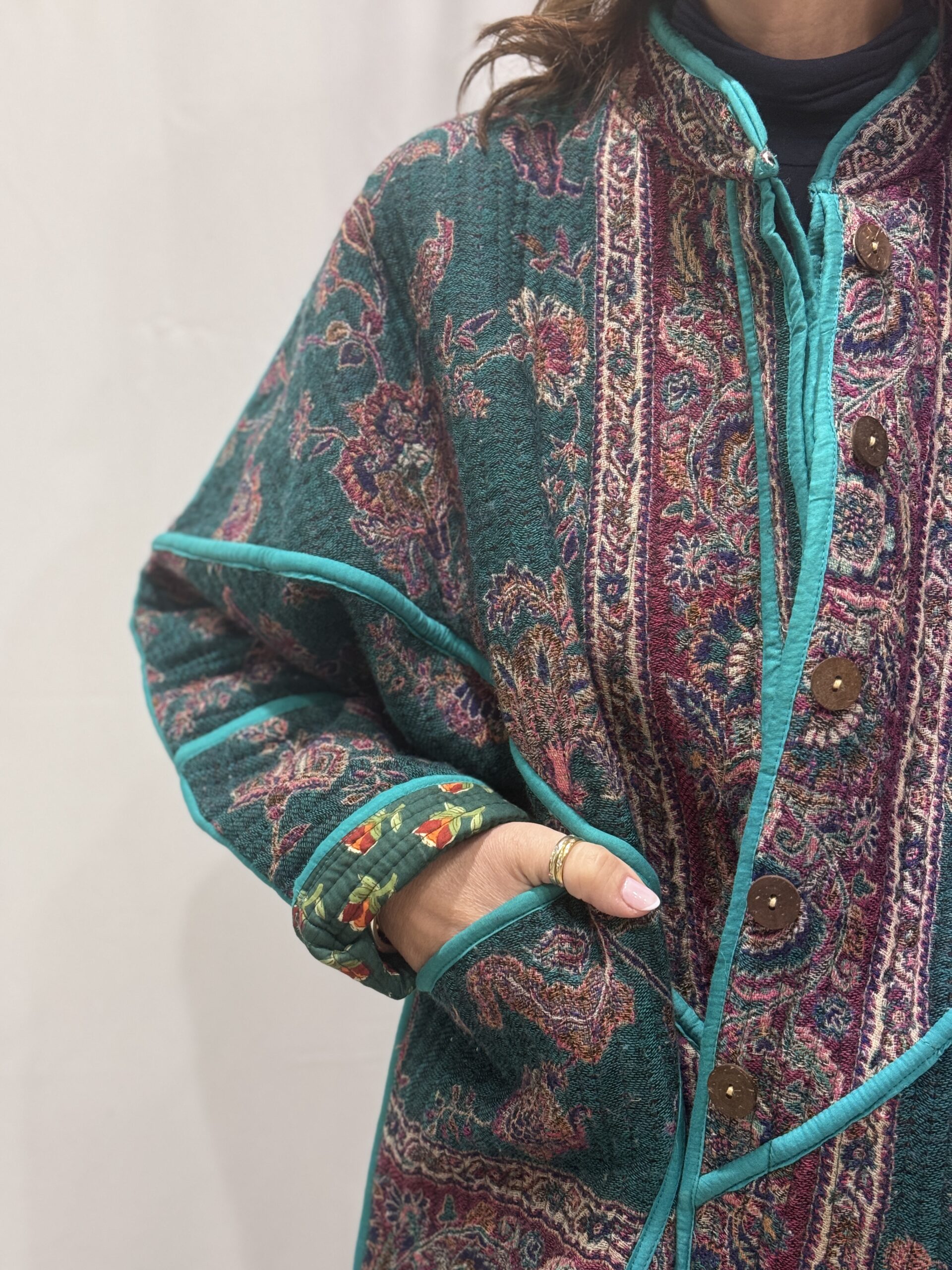Chaque veste est unique et réalisée en un seul exemplaire. Les jeux de couleurs, les motifs et les associations varient d’une pièce à l’autre.